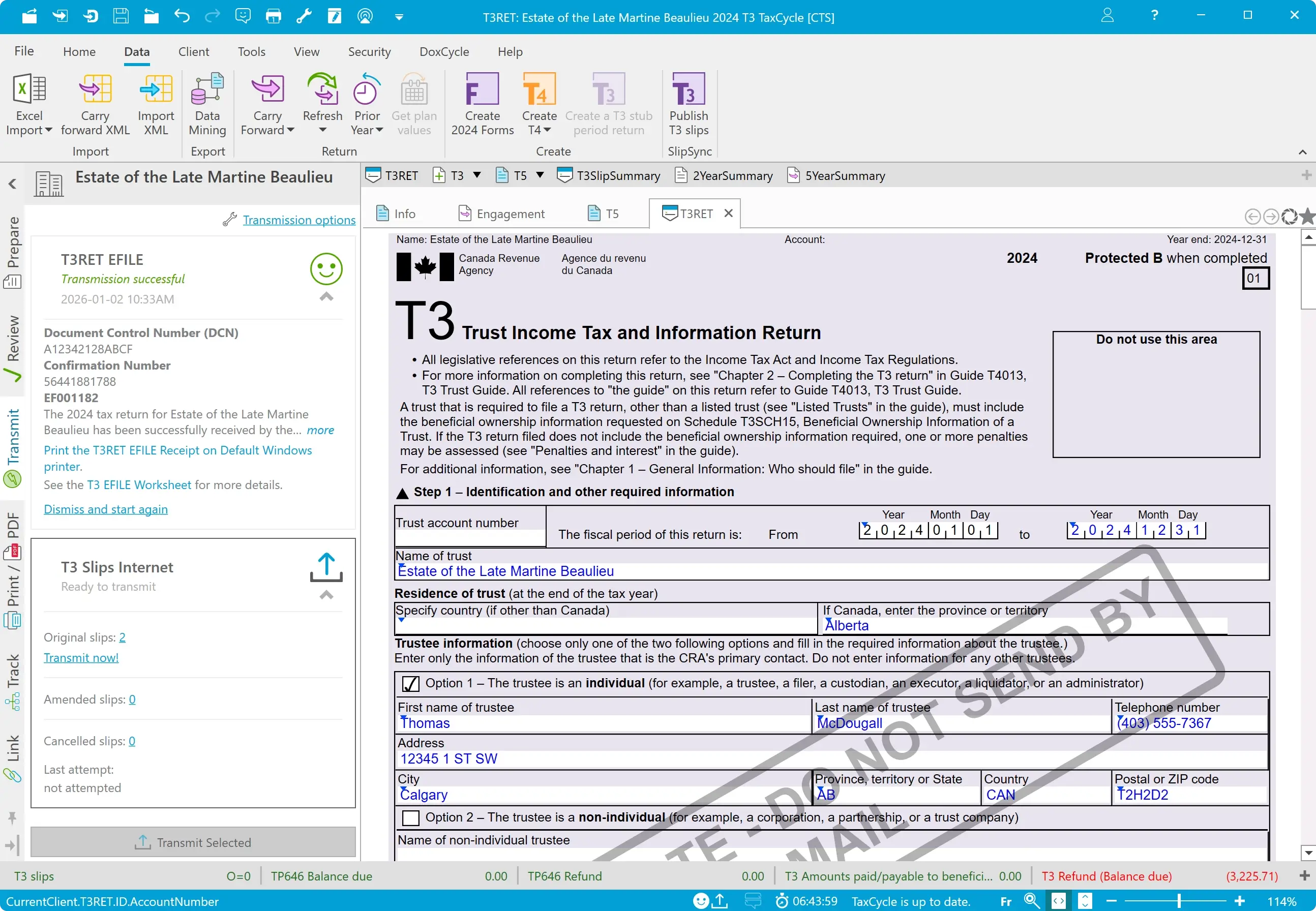 Effortlessly transfer taxpayer data from a TaxCycle T1/TP1 personal tax return into a TaxCycle T3/TP-646 trust return in a single click.