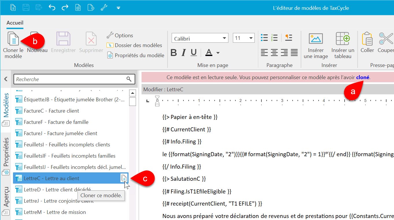 Par exemple, si vous clonez le modèle LettreC T1 de 2020, une copie du modèle est créée pour que vous puissiez le modifier, mais il remplace toujours la LettreC par défaut dans chaque fichier TaxCycle de 2020 et dans les jeux d'impression lorsque vous imprimez une déclaration.