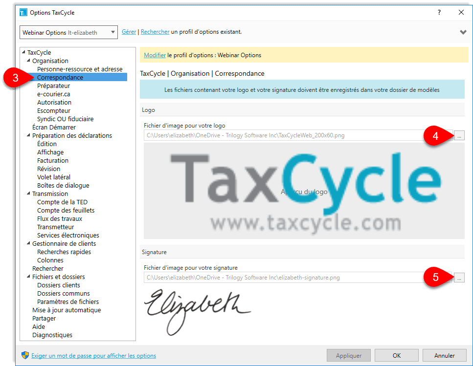 Dans la page Correspondance, insérez le logo et la signature qui seront utilisés dans les modèles de lettre. Ajoutez cette page aux profils d’options si ces paramètres doivent être utilisés dans l’ensemble de votre bureau. Lisez la rubrique d’aide Signature et logo (en anglais) pour en savoir plus.