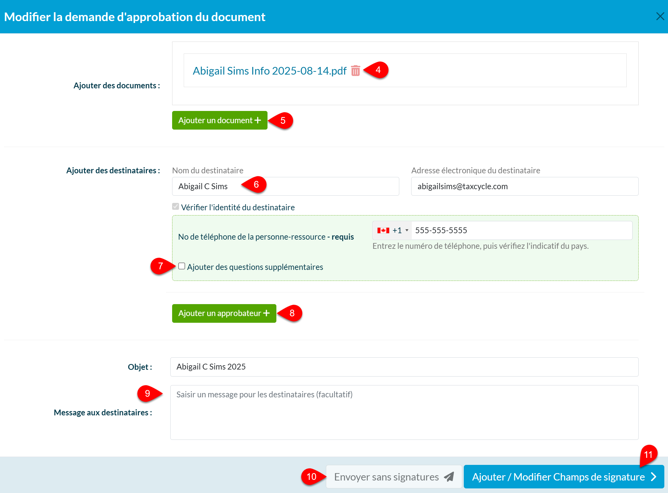 La modification du courriel de demande de signature vous permet de mettre à jour l'adresse électronique et le numéro de téléphone du destinataire, d'ajouter un autre signataire et de mettre à jour les documents à signer. Lorsqu'une demande modifiée est envoyée, le lien vers le document précédent devient inactif et un nouveau lien est envoyé au client.