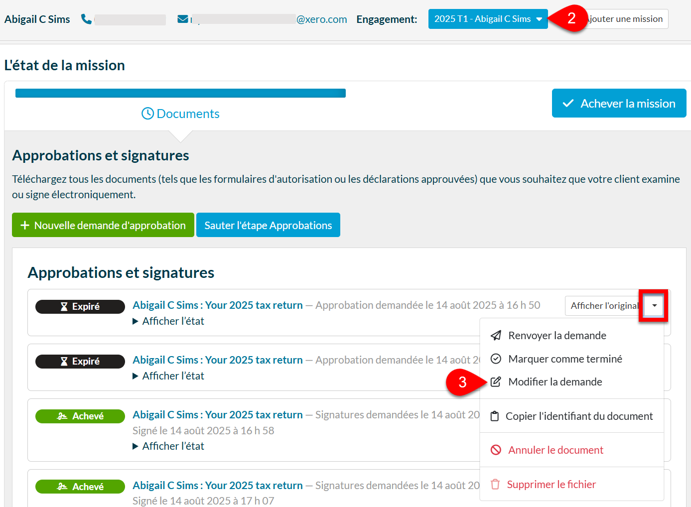 Pour modifier une demande de TaxCycle, vous devez annuler la demande existante et envoyer une nouvelle demande.