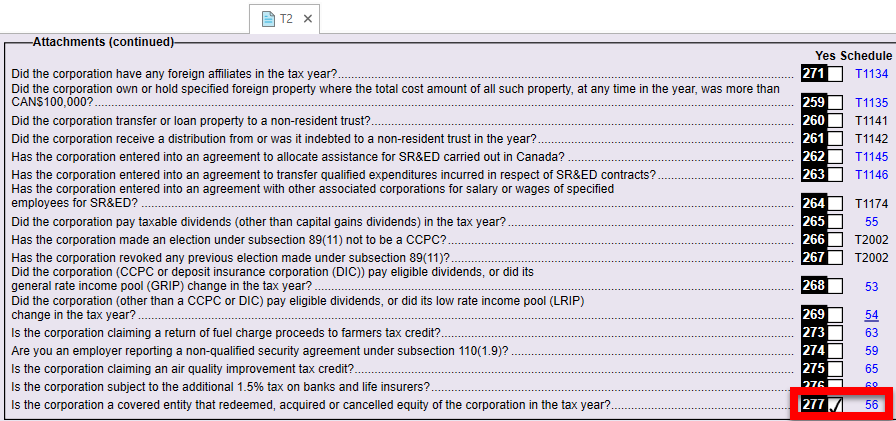 - Added a new check box on line 277 and new line 705 to calculate the new Schedule 56 (Part II.2 Tax on Repurchases of Equity).
