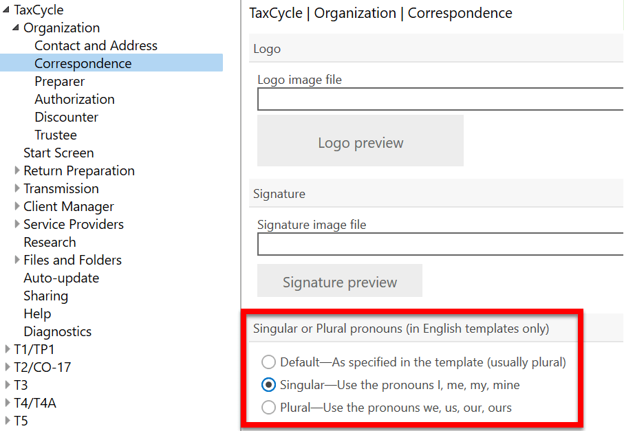 We added a new option that allows you to choose which pronouns show in letter and email templates. By default, TaxCycle templates use plural pronouns, including “we,” “us,” “our” and “ours.” If you prefer to address your clients using the pronouns “I,” “me,” “my” and “mine,” change the selection on the Correspondence page in Options.