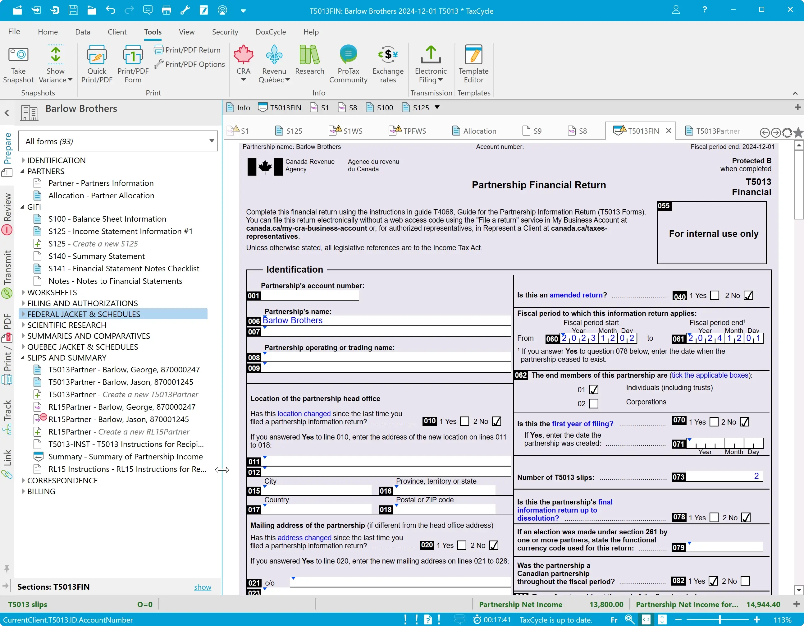 Prepare federal T5013 partnership returns and slips alongside Québec TP-600 returns and RL-15 relevés.