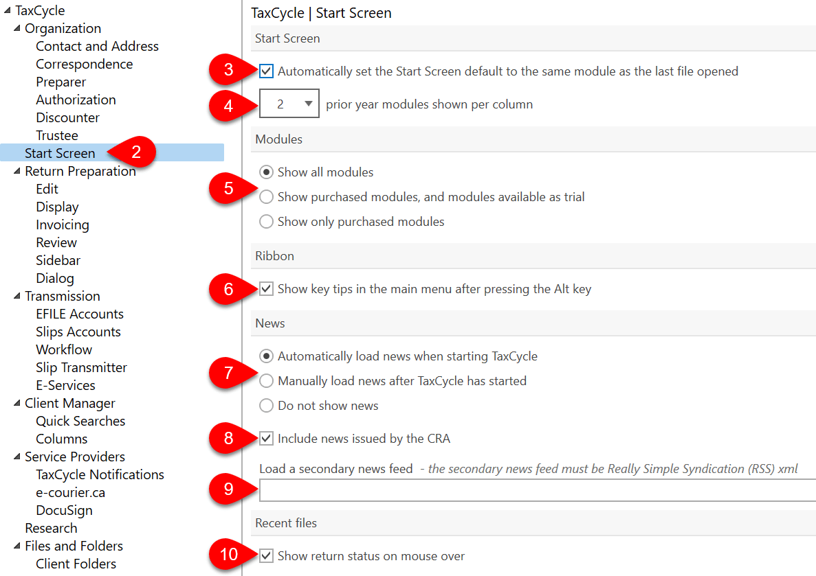 8. By default, the news feed shows on the Start screen when starting TaxCycle. If you prefer, you can show a link to manually load the feed later, or hide the news altogether.