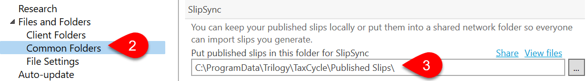 By default, published slips are saved in C:\ProgramData\Trilogy\TaxCycle\Published Slips. Change this to a shared folder on your network to make them available across your office.
