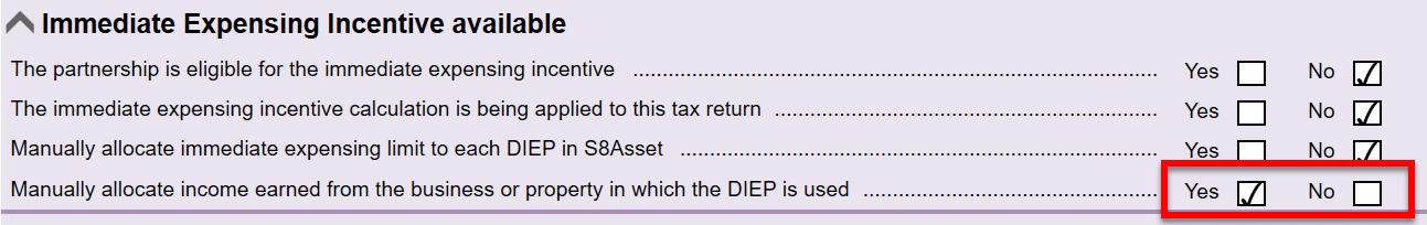 TaxCycle offers two ways of calculating immediate expensing incentive, depending on how you answer the following question on the S8Claim worksheet in T2 and T5013 returns: